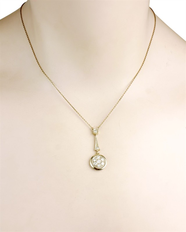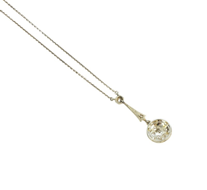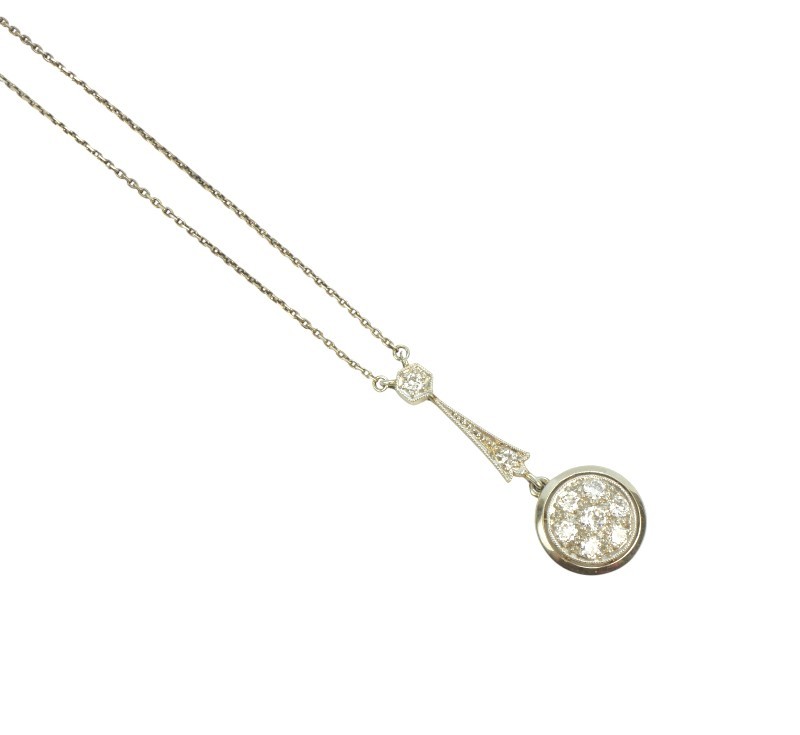 Elegantní kolier z bílého zlata ryzosti 585/1000 (punc lvíček) osazený diamanty briliantového brusu celkové hmotnosti 0,45 ct. Celková hmotnost šperku je 3,04 g. Délka řetízku je 43 cm. Délka ověsu 3 cm.