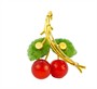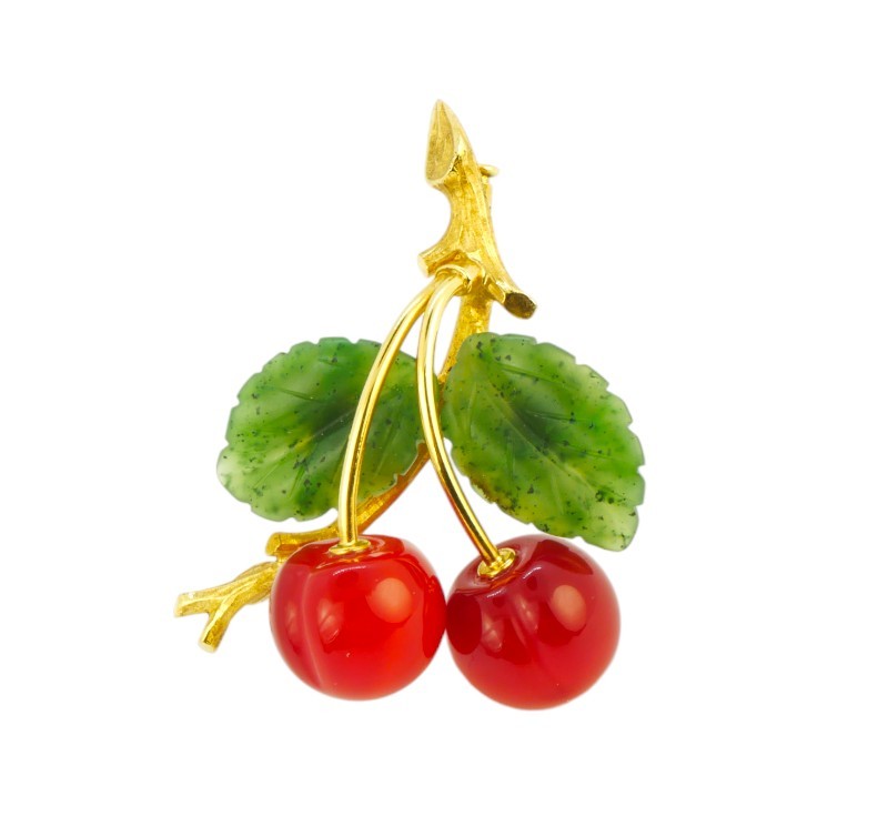 Brož ze zlata ryzosti 585/1000, kuličky třešní z karneolu, lístky z nefritu. Rozměry 4,9 x 4 cm, celková hmotnost 16,17 g.