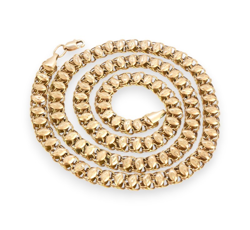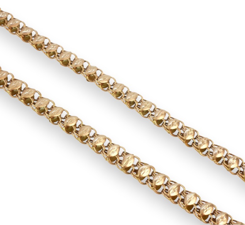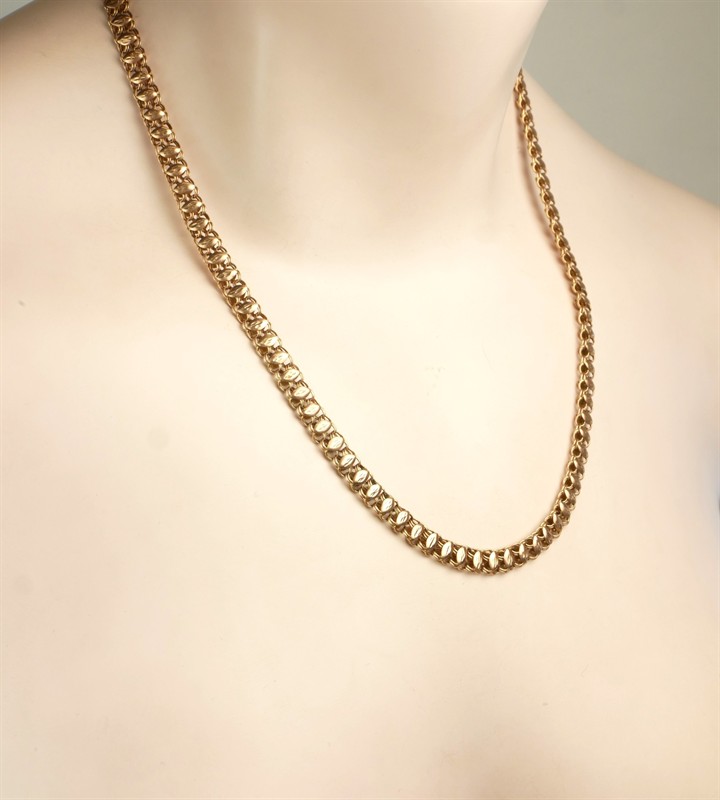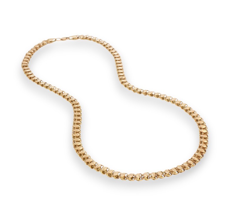 Jemný článkový náhrdelník ze růžového zlata ryzosti 585/1000 (punc labuť). Délka 49 cm, celková hmotnost 9,72 g.
