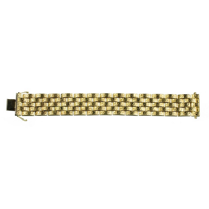 Náramek ze žlutého zlata zdobený jemným gravírem. Je vybaven dvěmi postranními pojistkami. Au 585/1000, hmotnost: 62,31g. Čechy, 30. léta 20. století. Délka: 19,2cm, šířka: 2,2cm.