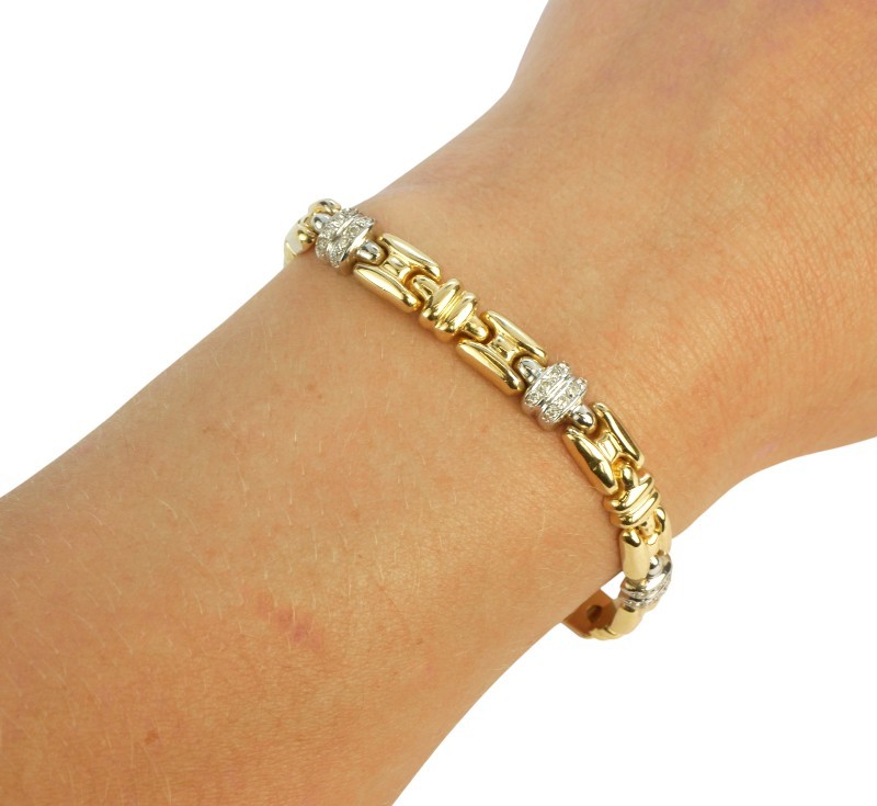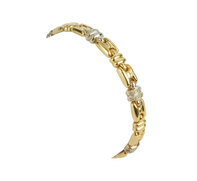 Článkový náramek byl zhotoven v kombinaci žlutého a bílého zlata. V každém článku z bílého zlata jsou zasazeny drobné briliantky (celková hmotnost v náramku cca 0,25 ct). Zlato ryzosti 585/1000, délka náramku 19 cm, hmotnost 15,90 g.