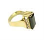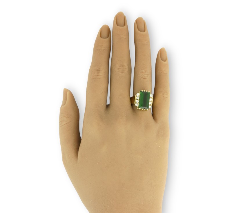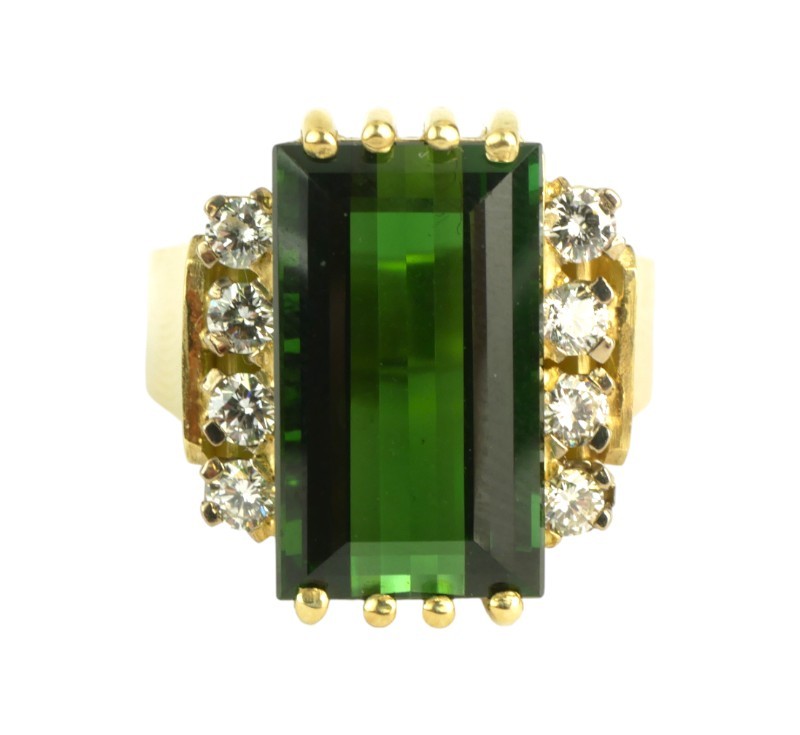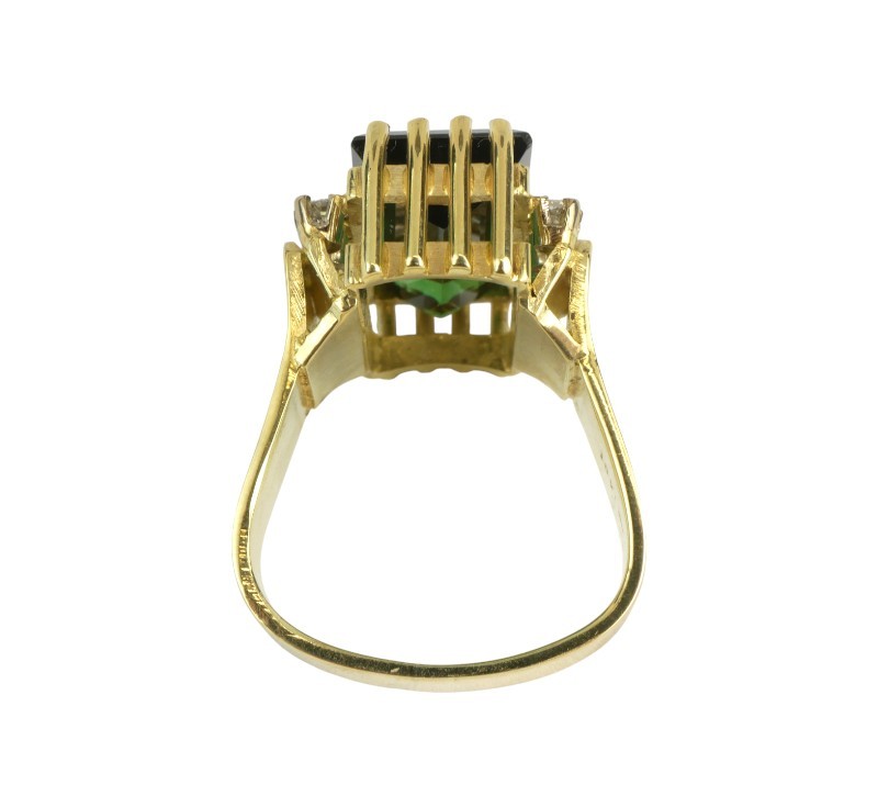Výrazný, koktejlový prsten, jemuž vévodí přírodní zelený turmalín brusu obdélný roháček o váze 6,60 ct, jež je velmi dobré kvality, po stranách doplněno přírodními diamanty o celkové váze 0,40 ct (0,05 ct - 8 ks), jež jsou vynikající kvality (čistota IF/VVS, barva D-E-F), precizně fasováno krapnami. Robustní hlavice, široká zahraněná šína zabraňující protáčení. Nadčasový, moderní design, západoevropská klenotnická práce ze 70. let 20. století. Investiční záležitost. Zhotoveno ze žlutého 14 karátového zlata, tj. o ryzosti 585/1000; nově opatřeno puncem Z-58 (labuť 4) a ryzostní číslo zevnitř šíny. Hmotnost 9,98 g, velikost 56, délka hlavice 16 mm, šířka 14 mm. Ve velmi zachovalém stavu, odborně vyčištěno a vyleštěno zlatníkem. Součástí odborný posudek.