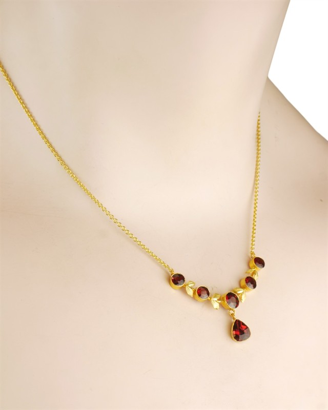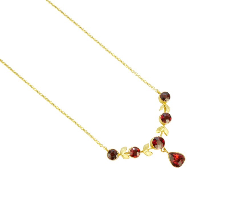 Jemný secesní náhrdelník ze žlutého zlata ryzosti 585/1000 je zdobený drobnými zlatými lístky a almandiny. Celková hmotnost náhrdelníku je 4,88 g. Délka cca 57 cm.