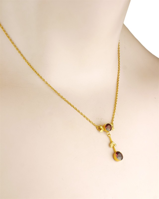 Secesní náhrdelník ze žlutého zlata ryzosti 585/1000 je zdobený drobnými lístky a almandiny. Celková hmotnost náhrdelníku je 3,40 g. Délka řetízku je 42 cm.