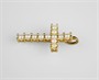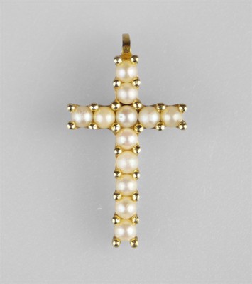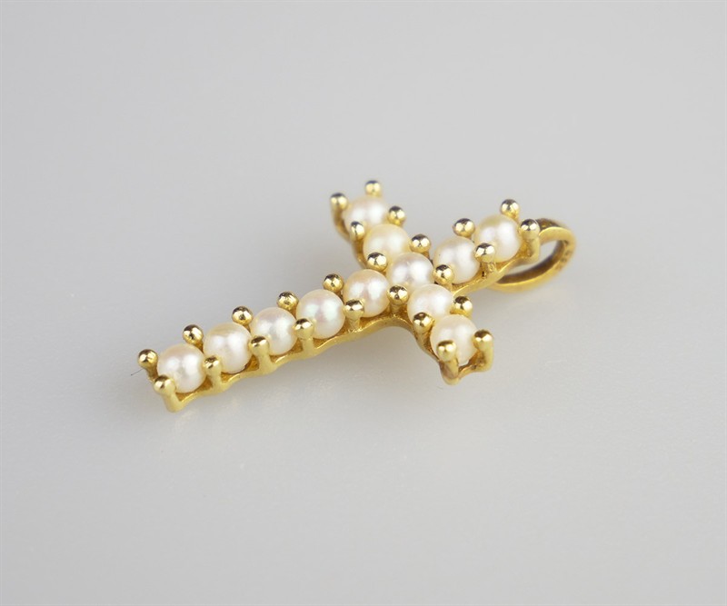 zlatý kříž s přírodními perlami, kvalitní zlatnická práce, Au 1,42 g/585/1000, Evropa, druhá polovina 20. století, punc, rozměr 2,6 x 1,45 cm