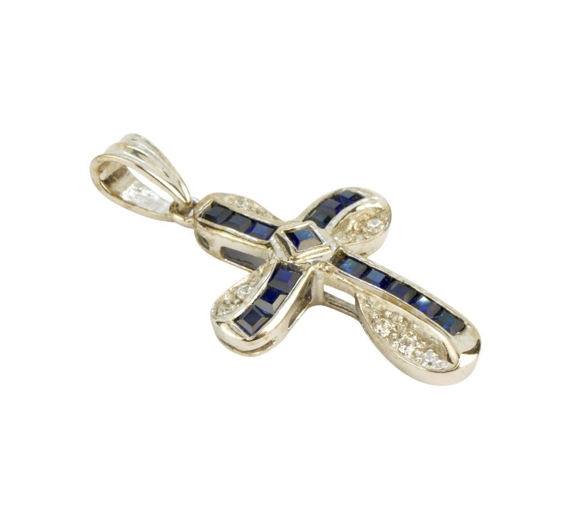 Závěs vyrobený ze zlata ryzosti 585/1000 zdobený brilianty a safíry. Rozměry křížku jsou 2,4 x 1,9 cm. Celková hmotnost 3,24 g.