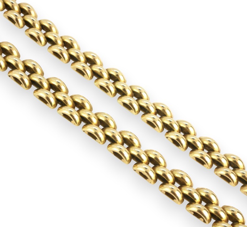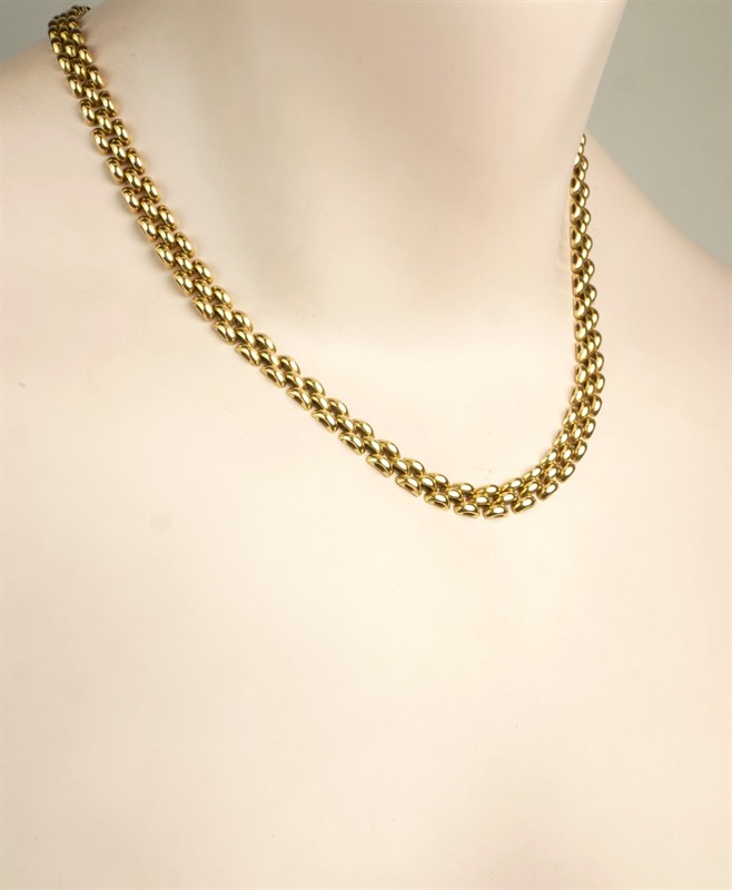 Elegantní článkový náhrdelník ze žlutého zlata ryzosti 585/1000 (punc labuť). Délka náhrdelníku 44 cm, celková hmotnost 26,81 g.
