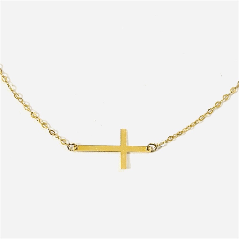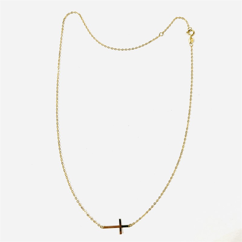 Jemný a decentní náhrdelník se symbolickou ozdobnou částí v podobě položeného latinského kříže, neodnímatelný řetízek vazby "anker" s možností prodloužení. Italská (oblast Arezzo) zlatnická práce z počátku 21. století. Zhotoveno ze žlutého 9 karátového zlata, tj. o ryzosti 375/1000; nově opatřeno puncem Z-59 (písmeno Z s alchymistickou růží), italský punc (Arezzo) a ryzostní číslo na puncovní destičce. Hmotnost 0,86 g, nastavitelná délka 43 nebo 40 cm, délka kříže 13 mm, šířka vazby 1 mm. Zapínání formou pérového kroužku v pořádku, celkově ve velmi zachovalém stavu, odborně vyčištěno a vyleštěno zlatníkem.