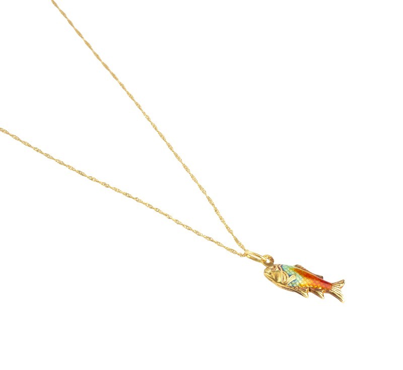 Náhrdelník vyrobený ze zlata ryzosti 585/1000 zdobený přívěskem se smaltovanou rybkou. Rozměry přívěsku 2,2 x 1,0 cm. Celková hmotnost 3,26 g. Délka řetízku 44 cm. Punc lyra.