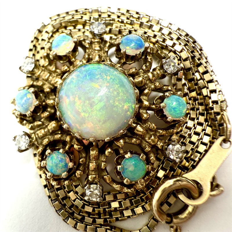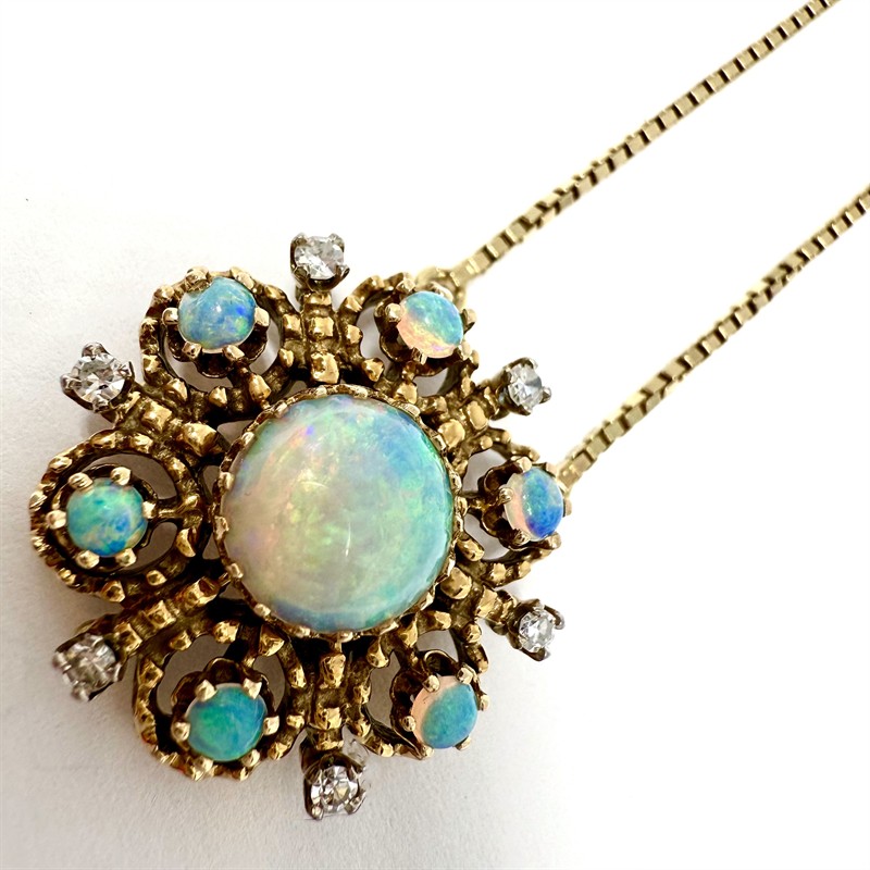 Půvabný zlatý náhrdelník. Šperk vyrobený ze 14ti karátového zlata (585/1000) zdobí centrální, neodnímatelný závěs ve tvaru květu. Ten byl osazen sedmi australskými opály nejvyšší kvality. Kameny se pyšní vysokou opalizací a mají překrásný, sytý modrozelený nádech. Celkový dojem dotváří 6 briliantů. Průměr závěsu cca 2 cm. Délka řetízku 41,5 cm. Váha 7,99 g. Luxusní,zlatý šperk v perfektním stavu.