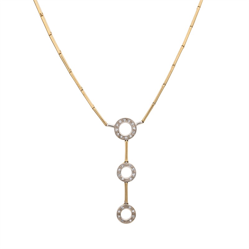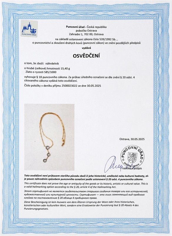 zlato o ryzosti 585/1000 váha 15,40 g výška přívěsku 4,6 cm délka řetízku 47 cm brilianty cca 0,14 ct výborný stav osvědčení puncovního úřadu