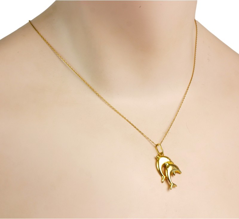 Náhrdelník ze žlutého zlata ryzosti 585/1000. Přívěšek ve tvaru dvou delfínů ve skoku. Rozměry přívěsku 2,4 x 1,6 cm. Celková hmotnost náhrdelníku 2,72 g.