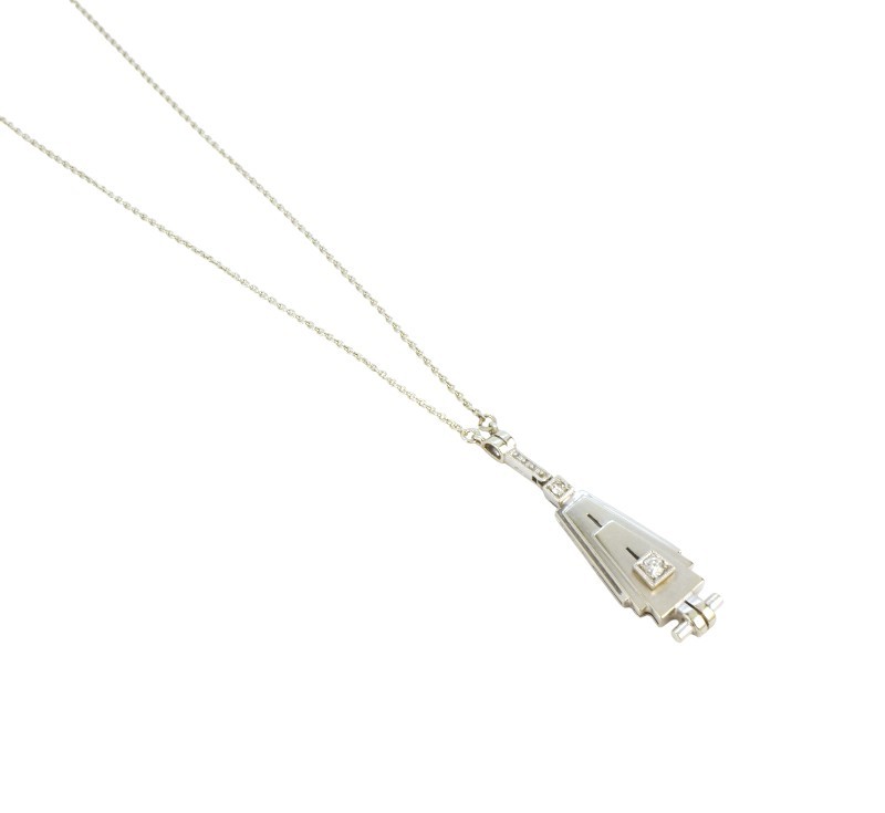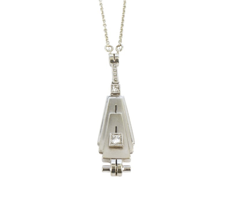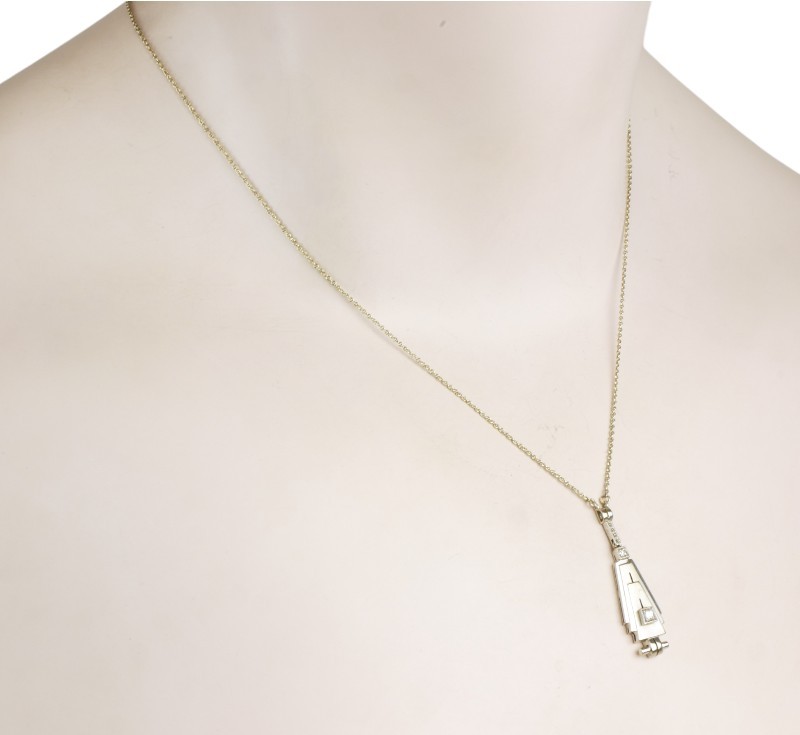 Náhrdelník z období Art deco vyrobený z bílého zlata ryzosti 750/1000 zdobený diamantem. Rozměry přívěsku 3,0 x 0,9 cm. Délka řetízku 43 cm. Celková hmotnost 3,56 g.