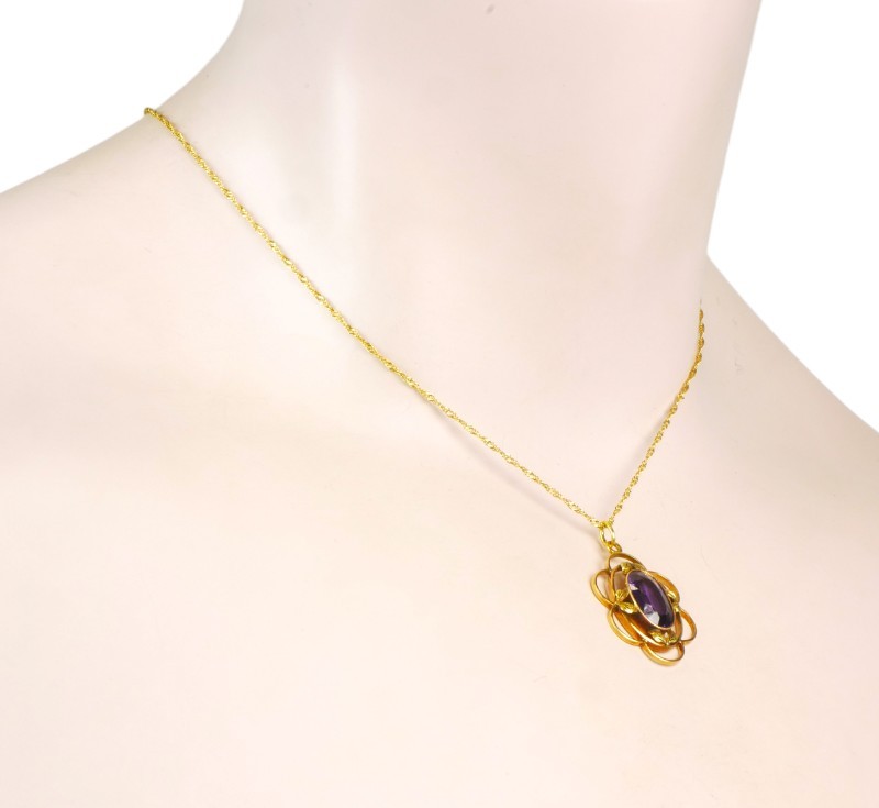 Náhrdelník ze žlutého zlata ryzosti 585/1000 zdobený oválným fialovým kamenem. Délka řetízku 41 cm, rozměry závěsu 2,6 x 1,6 cm. Celková hmotnost 3,62 g.