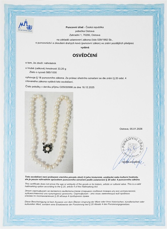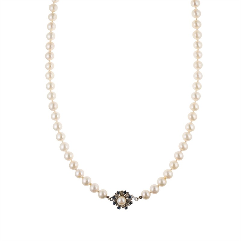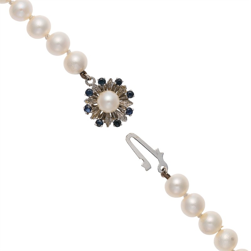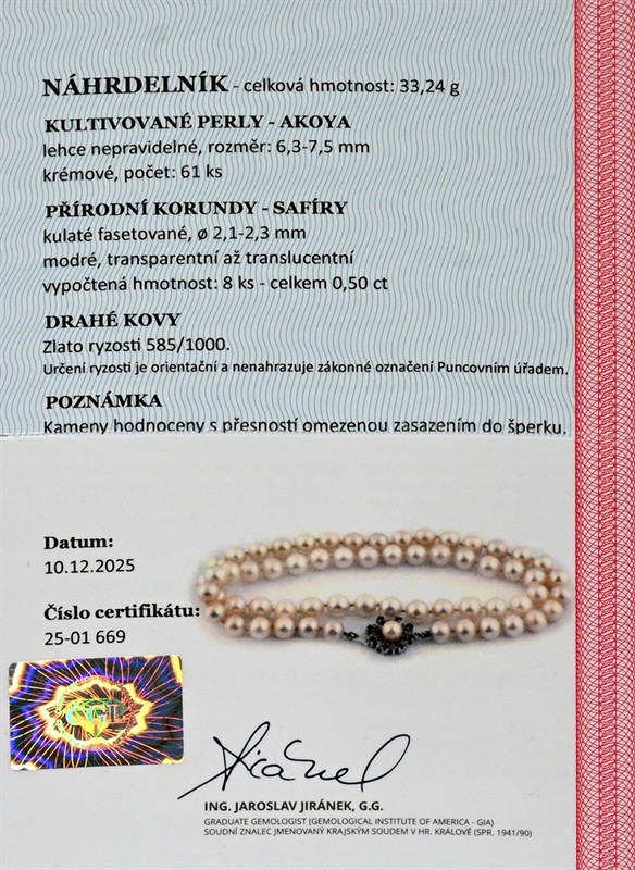 Materiál: žluté zlato o ryzosti 585/1000 Hmotnost: 33,20 g Rozměry: délka 47,5 cm, průměr ozdoby 1,5 cm Drahokamy: - 61 ks kultivovaných mořských perel Akoya, lehce nepravidelné, rozměr 6,3–7,5 mm - 8 ks přírodních safírů, celkem 0,50 ct, kulatý fasetový brus, průměr 2,1–2,3 mm Doklady: - osvědčení Puncovního úřadu České republiky - certifikát gemologické laboratoře je součástí šperku Pro vaše maximální pohodlí nabízíme kompletní zlatnický servis: úpravy velikosti, odborné opravy, rhodiování, výměny kamenů, profesionální čištění, leštění i znalecké odhady. Vše přizpůsobíme vašim přáním.