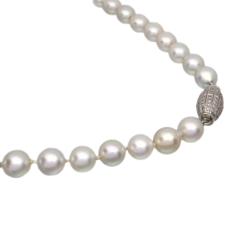 18 karátové bílé zlato 750/1000, celková hmotnost 40,75 g | Mořské perly Akoya se stříbrným nádechem | Přírodní diamanty briliantového brusu o celkové hmotnosti 0,50 ct | Krásný stav | 2.polovina 20.století | Délka 45 cm | Velikost perly cca 0,8-0,9 cm | Kameny zkontrolovány v gemologické laboratoři | Zařizujeme veškerý profesionální zlatnický servis - úpravy velikosti, opravy, rhodiování, čištění, výměnu kamenů, znalecké odhady, certifikace a další služby dle vašich potřeb.