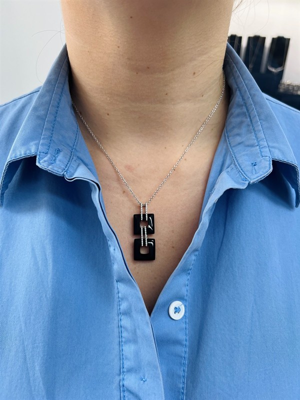 Bílé zlato o ryzosti 585/1000 váha 8,13 g délka řetízku 44,5 cm výška přívěsku 4 cm, šířka přívěsku 1,4 cm onyx 2 ks 17,08 ct přírodní diamant 0,13 ct výborný stav nová práce puncováno platným puncem kameny s garancí pravosti zkontrolované v gemologické laboratoři Nabízíme kompletní zlatnický servis na nejvyšší úrovni – od úprav velikostí a odborných oprav přes rhodiování, čištění, leštění až po výměnu kamenů a znalecké posudky. Vše přizpůsobíme vašim přáním.