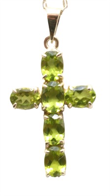 Zlatý náhrdelník s peridoty (olivíny). Žluté zlato 375/1000. Přírodní peridoty (olivíny). Celková váha: 3,5 ct. Váha náhrdelníku: 5,43 g. Délka řetízku: 53 cm. Rozměr ověsu: 3 cm x 2 cm.