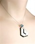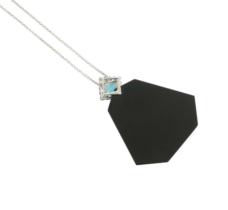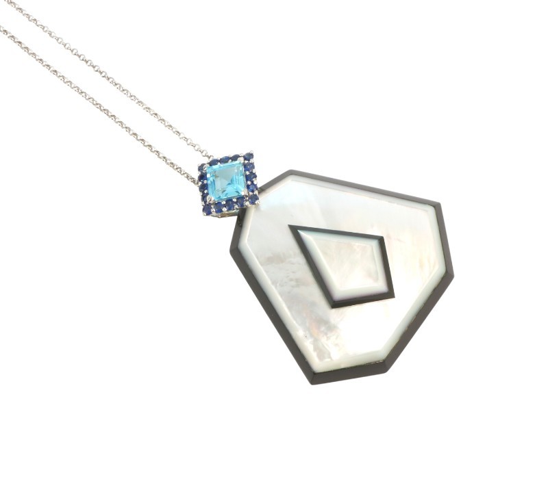 Náhrdelník z bílého zlata ryzosti 585/1000 s perletí, topazem o hmotnosti 1 ct a safíry o celkové hmotnosti 0,50 ct. Celková hmotnost šperku je 15,33 g. Délka řetízku je 45 cm. Rozměr přívěsku 3,5 x 4,5 cm.