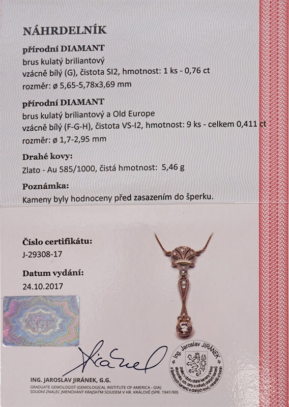 Materiál: zlato o ryzosti 585/1000 Hmotnost: 5,46 g Rozměry: výška 4,5, šířka 1 cm, délka řetízku 42,5 cm 1 ks přírodní diamant, celkem 0,76 ct, vzácně bílý (G), čistota SI2, průměr 5,65-5,78x3,69 mm 9 ks přírodní diamant Old Europe, celkem 0,411 ct, vzácně bílý (F-G-H), čistota VS-I2, průměr 1,7-2,95 mm Stav: výborný Doklady: Osvědčení Puncovního úřadu České republiky Certifikát z gemologické laboratoře je součástí šperku Pro vaše maximální pohodlí nabízíme kompletní zlatnický servis: úpravy velikosti, odborné opravy, rhodiování, výměny kamenů, profesionální čištění, leštění i znalecké odhady. Vše přizpůsobíme vašim přáním.