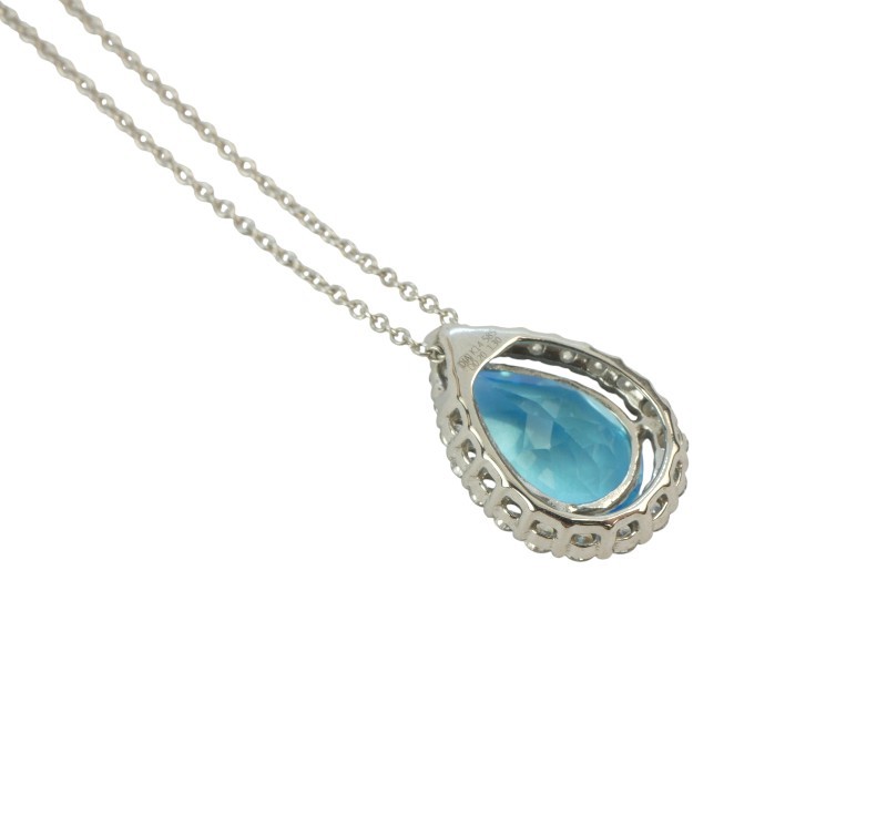 Náhrdelník z bílého zlata ryzosti 585/1000 s topazem o celkové hmotnosti 1,30 ct a diamanty briliantového brusu o celkové hmotnosti 0,20 ct. Celková hmotnost šperku je 1,74 g. Délka řetízku je 45 cm.