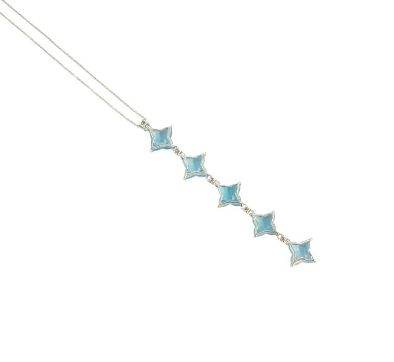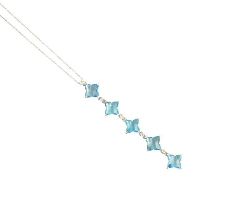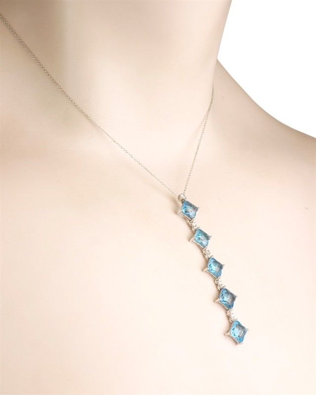 Náhrdelník z bílého zlata ryzosti 585/1000 s topazy o celkové hmotnosti 5,40 ct a diamanty briliantového brusu o celkové hmotnosti 0,10 ct. Celková hmotnost šperku je 3,83 g. Délka řetízku je 45 cm.