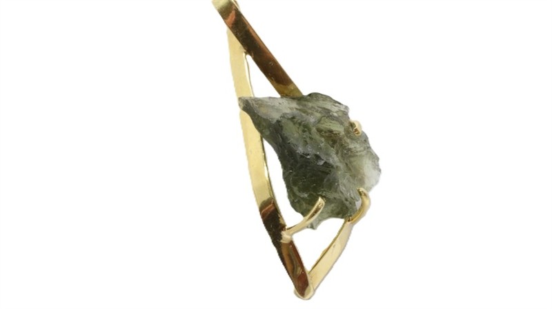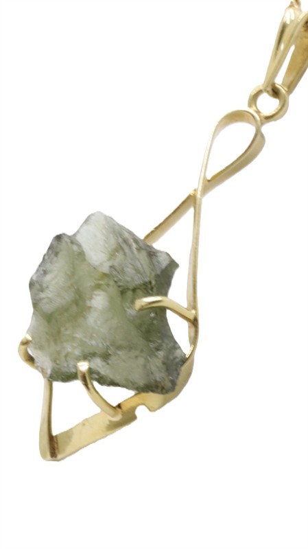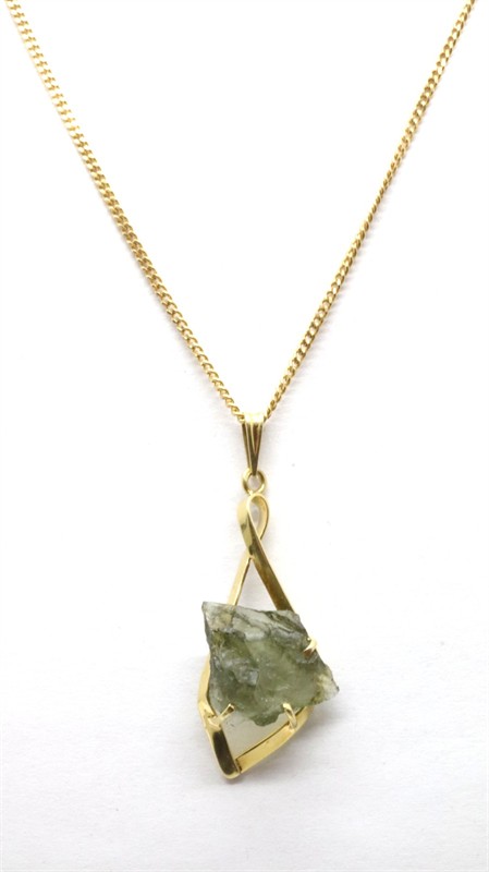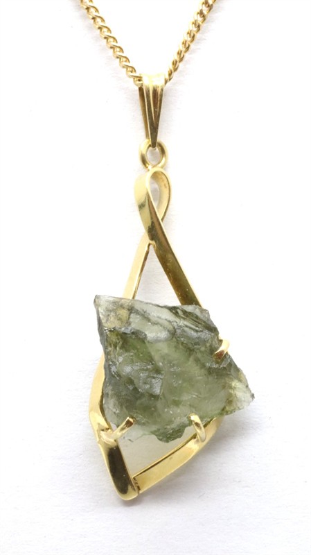 Zlatý náhrdelník s vltavínem. Žluté zlato 585/1000. Přírodní vltavín. Váha náhrdelníku: 5,78 g. Délka řetízku: 37 cm. Rozměr ověsu: 3,5 cm x 1,5 cm.