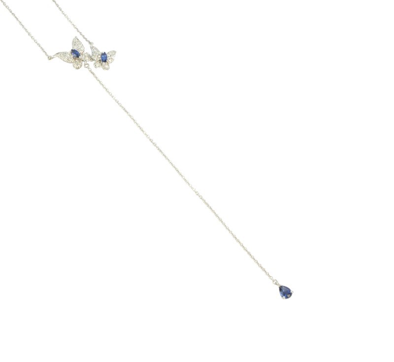Náhrdelník z bílého zlata ryzosti 585/1000 se safíry o celkové hmotnosti 0,20 ct a diamanty briliantového brusu o celkové hmotnosti 0,15 ct. Celková hmotnost šperku je 2,43 g. Délka řetízku je 45 cm.