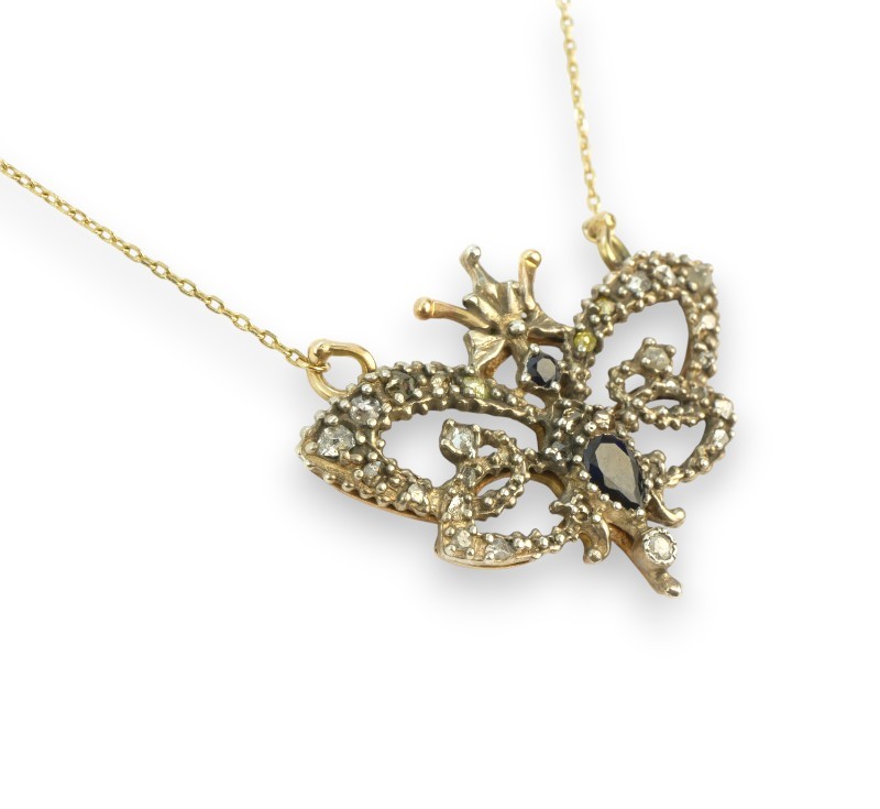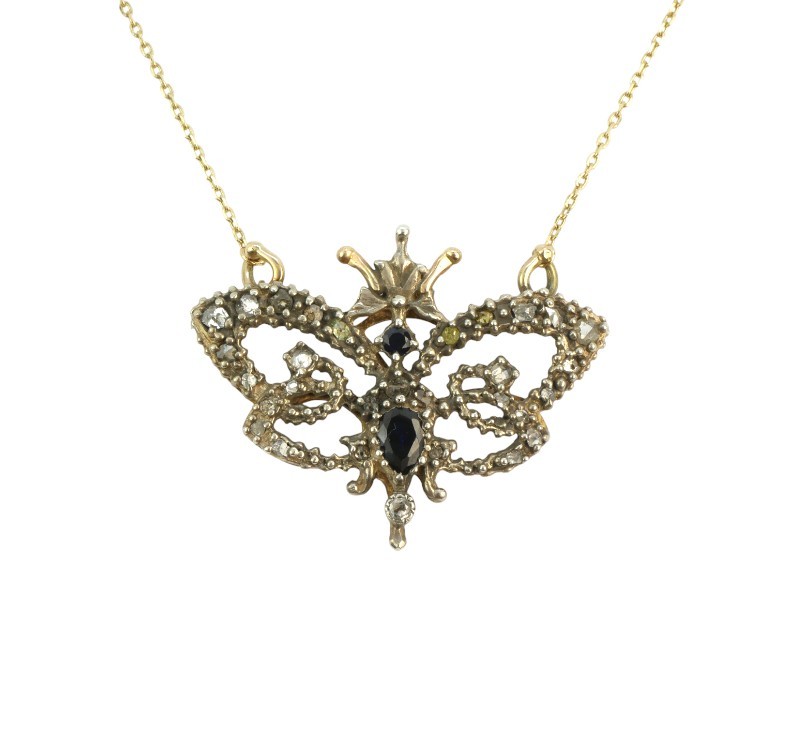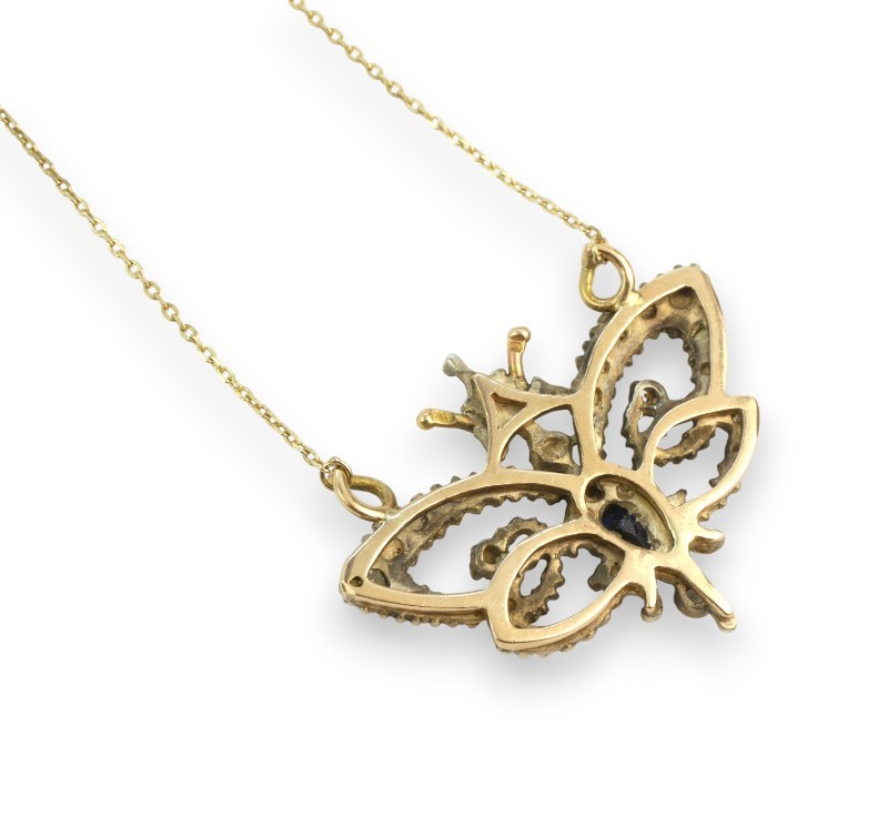 Náhrdelník ze zlata ryzosti 550/1000 zdobený safírem a diamantovými routami ve tvaru motýla. Kameny zasazeny do stříbra ryzosti 925/1000. Rozměry závěsu 3,5 x 2,7 cm. Celková hmotnost 7,47 g. Délka řetízku 45 cm. Ke šperku je přiloženo osvědčení Puncovního úřadu.