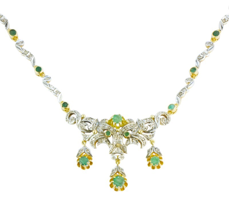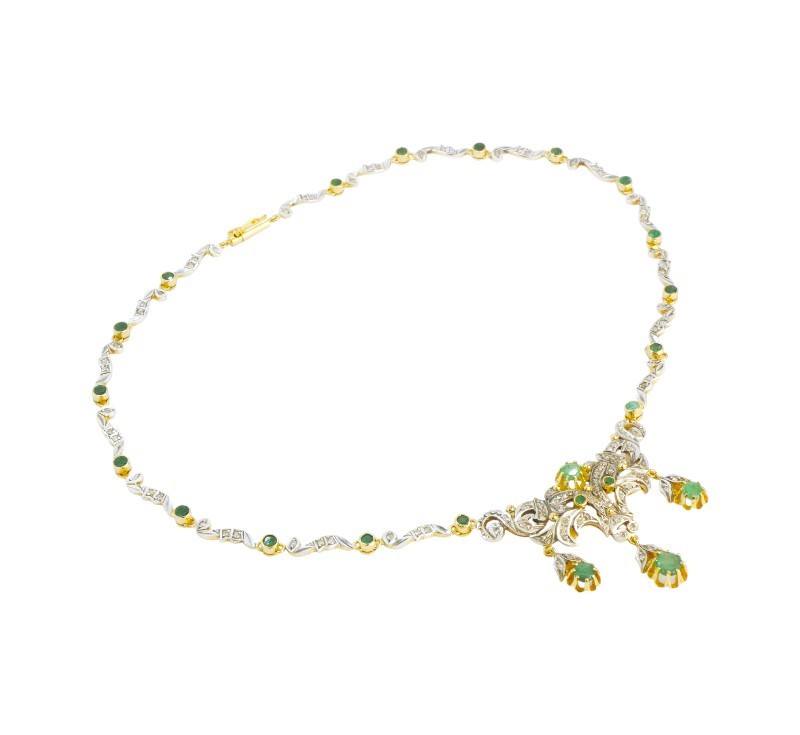Mimořádný secesní zlatý náhrdelník se smaragdy a brilianty je vyroben ze zlata ryzosti 710/1000, kameny jsou osazeny ve stříbře 925/1000. Náhrdelník je osazen 4 výraznými smaragdy a po svém obvodu 19 drobnějšími smaragdy a dále drobnými brilianty o hmotnosti cca 0,5 ct. Délka náhrdelníku 42 cm. K náhrdelníku je přiloženo osvědčení Puncovního úřadu. Hmotnost náhrdelníku 27,66 g.
