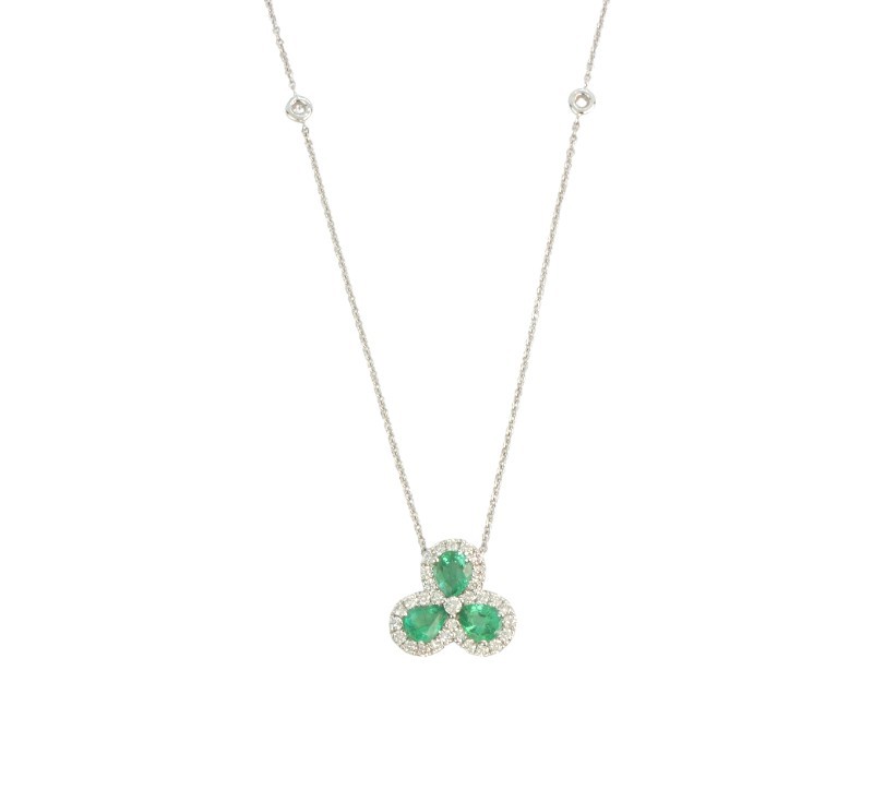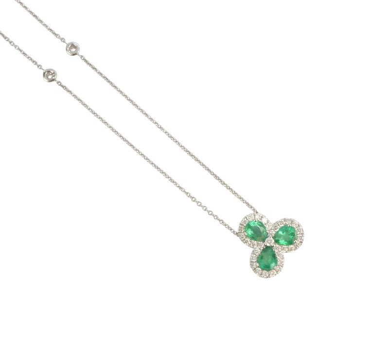 Náhrdelník z bílého zlata ryzosti 585/1000 se smaragdy a diamanty briliantového brusu o celkové hmotnosti 0,35 ct. Celková hmotnost šperku je 2,59 g. Délka řetízku je 45 cm.