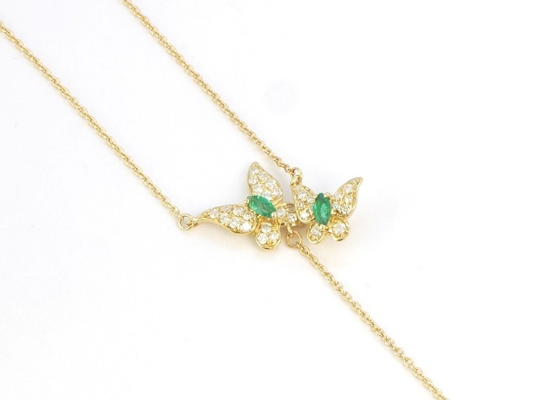 Náhrdelník ze žlutého zlata ryzosti 585/1000 se smaragdy o celkové hmotnosti 0,20 ct a diamanty briliantového brusu o celkové hmotnosti 0,15 ct. Celková hmotnost šperku je 2,37 g. Délka řetízku je 45 cm.