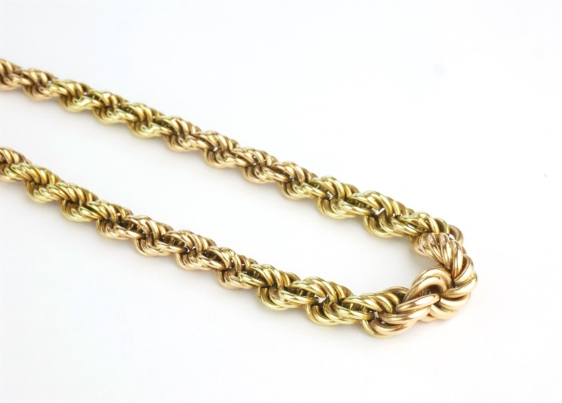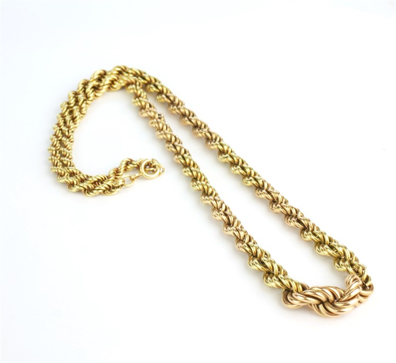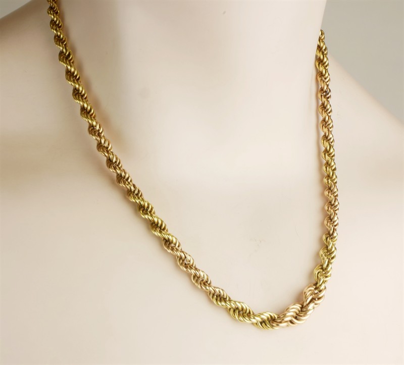Náhrdelník vyrobený z kombinace žlutého a růžového zlata ryzosti 585/1000 (punc lvíček).. Délka 42 cm. Hmotnost 16,60 g. Řetízek se z úzké části směrem ke středu rozšiřuje. Výborný stav.