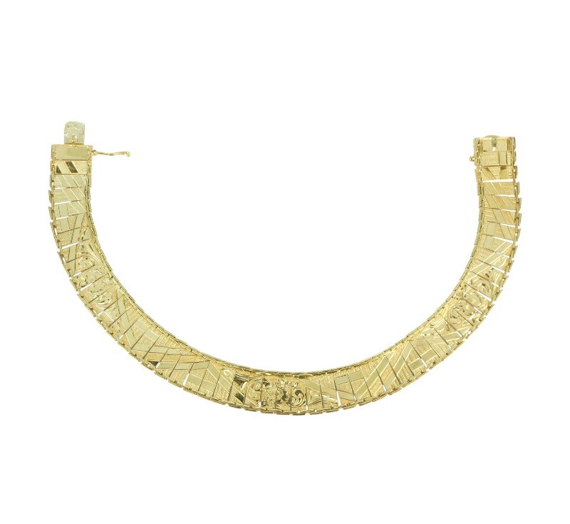 Prvorepublikový článkový náramek ze žlutého zlata ryzosti 585/1000 (punc lvíček) je gravírovaný po celé své délce. Délka náramku je 19,8 cm. Celková hmotnost náramku je 10,70 g.