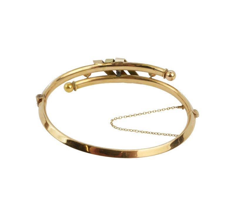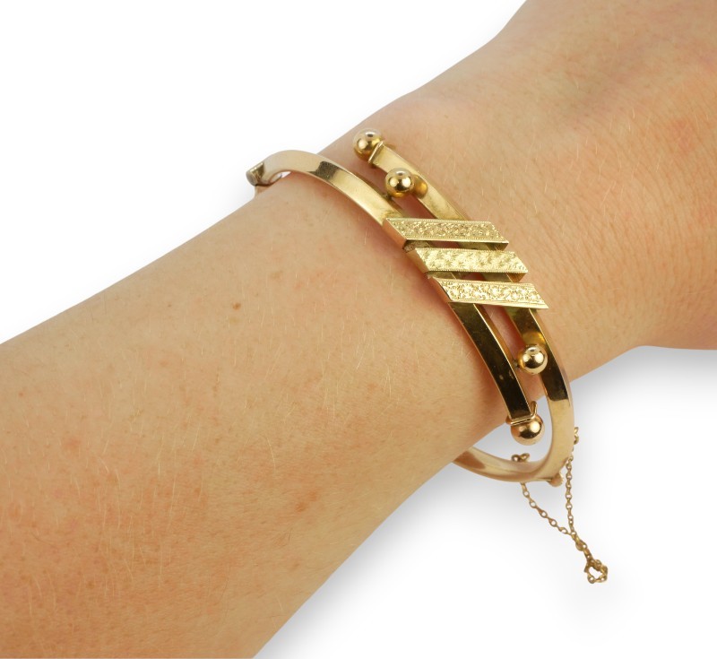Náramek ze zlata ryzosti 585/1000. Vnitřní rozměry náramku 6,3 x 5,3 cm. Celková hmotnost 7,50 g.