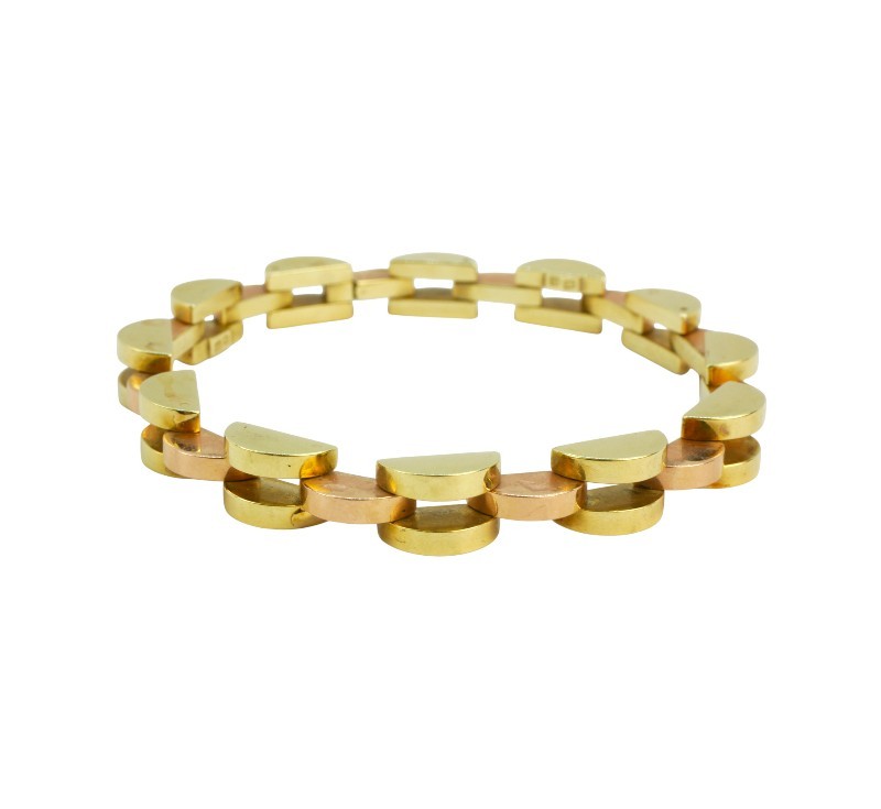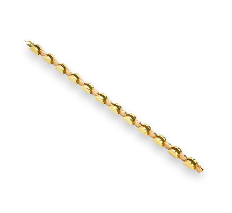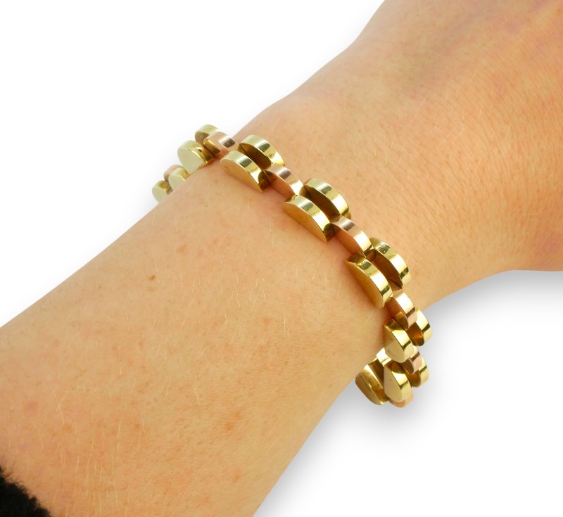 Prvorepublikový art deco náramek ze žlutého a růžového zlata ryzosti 585/1000. Délka 19 cm. Celková hmotnost 18,78 g. Náramek je v původní etui.