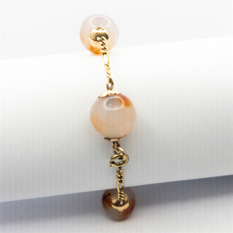 Starožitný Art deco zlatý náramek s acháty, pravděpodobně chalcedony karneolového typu s mléčně bílým až oranžovo-hnědým žíháním, jednotlivé kuličky jsou uchyceny do zlatých čepiček a spojeny článkovým řetízkem, náramek je typickým příkladem středoevropské výroby šperků stylu Art Deco, zlato o ryzosti 14 karátů 585/1000 o celkové hmotnosti 26,30 g, délka náramku: 22 cm