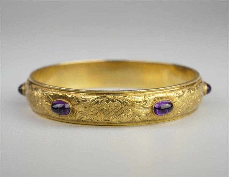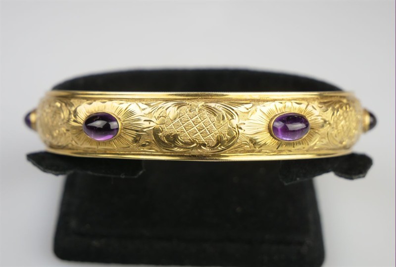 zlatý kruhový náramek s ametystovými muglemi, po celém obvodu zdobený gravírováním, Au btto 20,84 g/585/1000, československý meziválečný dovozový punc (lyra), západní Evropa, kolem r. 1935; obvod 21,5 cm
