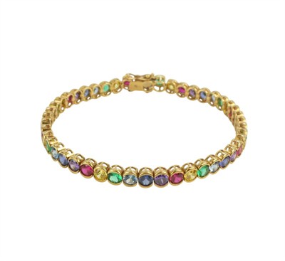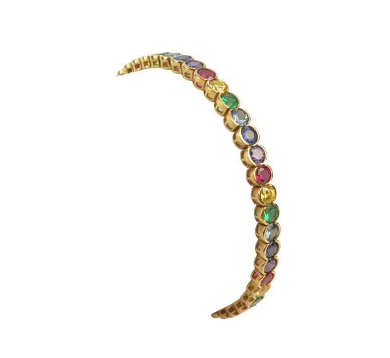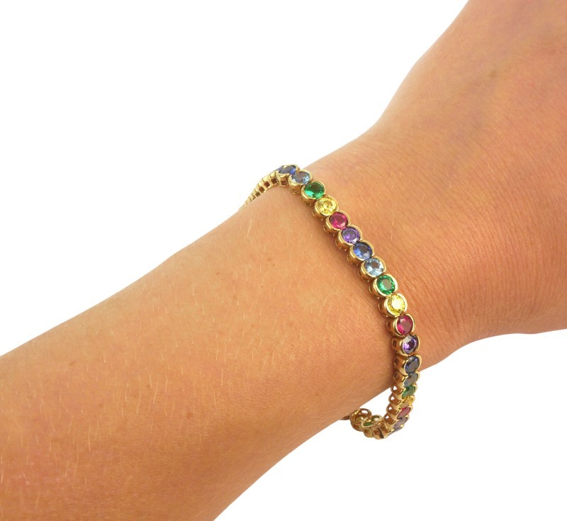 Hravý zlatý náramek s barevnými kameny, zlato ryzost 375/1000, hmotnost náramku 14,25 g. Délka náramku 19 cm.