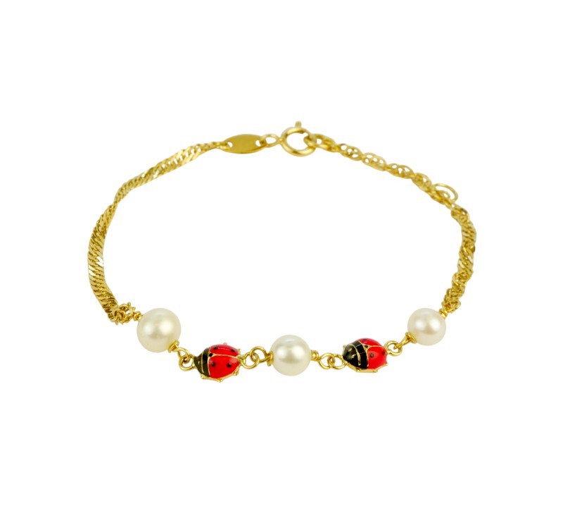 Dětský náramek s beruškami a perličkami, zhotoven ze žlutého zlata ryzosti 750/1000. Délka náramku je 15 cm. Celková hmotnost 1,63 g.