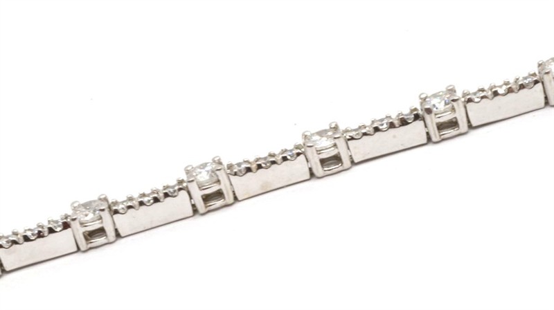 Zlatý náramek s diamanty. Bílé zlato 585/1000. Přírodní diamanty, kvalita SI1 - SI2, barva H - I, celková váha 2,99 ct. Váha náramku: 8,87 g. Délka náramku: 18 cm. K náramku je vypracován odborný posudek.