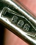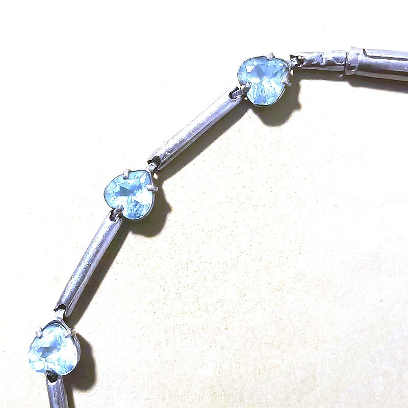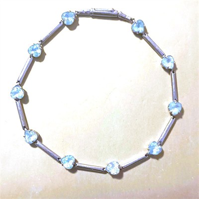 Náramek z bílého zlata s modrými kameny - spinely? ve tvaru srdíček. Hmotnost 8,6 g, délka 20 cm, ryzost 585/1000. Bezvadně zachovalý. Punc labuť.
