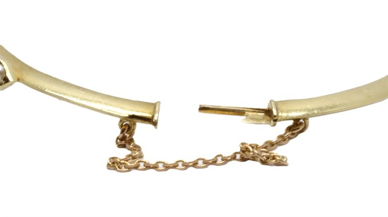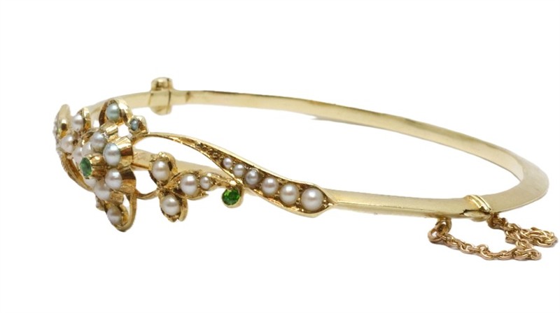 Zlatý náramek s přírodními kameny a perličkami. Žluté zlato 585/1000. Přírodní kameny. Perličky. Váha náramku: 10,87 g. Vnitřní rozměr náramku: 5,5 cm x 4,8 cm.
