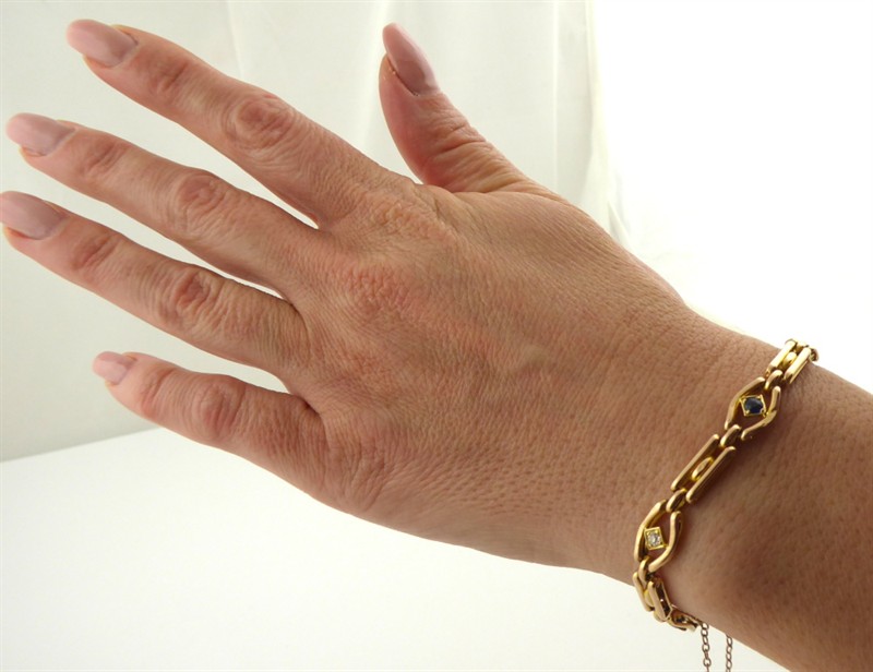 Čtrnáctikarátové zlato, přírodní safíry a přírodní diamanty. Ryzost Au 585/1000, celková hmotnost 8,40 g. Velmi působivý zlatý článkový náramek na drobnější dámské zápěstí se třemi přírodními diamanty starého briliantového brusu o celkové váze 0,25 ct, barva G, čistota P doplněnými o tři články s třemi přírodními ručně broušenými safíry modře syté barevnosti. Náramek je ve výborném stavu a má bezpečnostní pojistku na zavírání. Nově označeno platným českým puncem labuť. Evropa 1900 - 1920. Délka 90 mm.