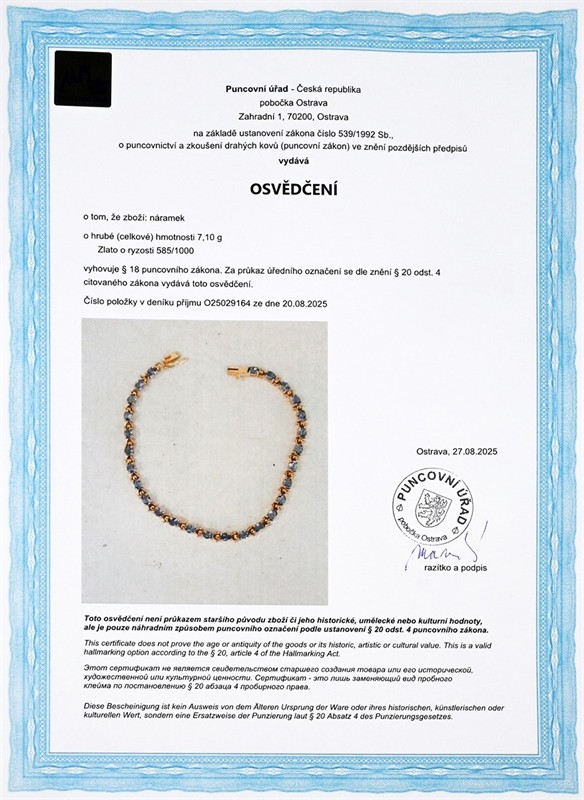 Zlato o ryzosti 585/1000 váha 7,10 g délka 18,5 cm, šířka 0,4 cm přírodní tanzanity cca 5,4 ct výborný stav osvědčení puncovního úřadu kameny s garancí pravosti zkontrolované v gemologické laboratoři