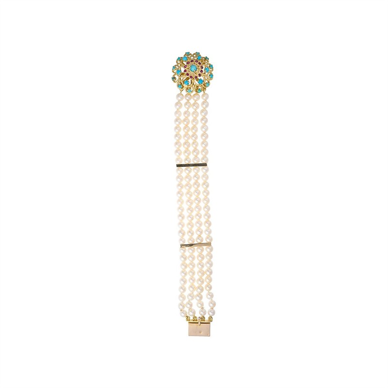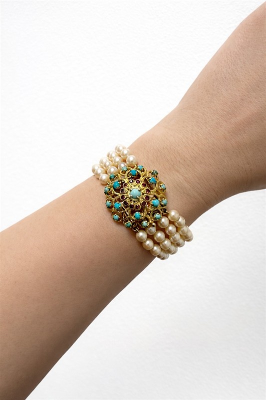 Zlatý náramek s přírodními tyrkysy, rubíny a perlami