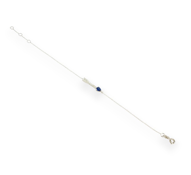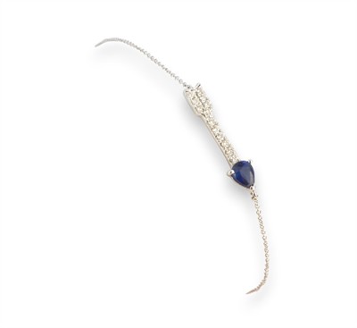 Náramek z bílého zlata ryzosti 585/1000 se safírem a diamanty briliantového brusu o celkové hmotnosti 0,10 ct. Celková hmotnost náramku je 1,05 g. Délka 18,3 cm.
