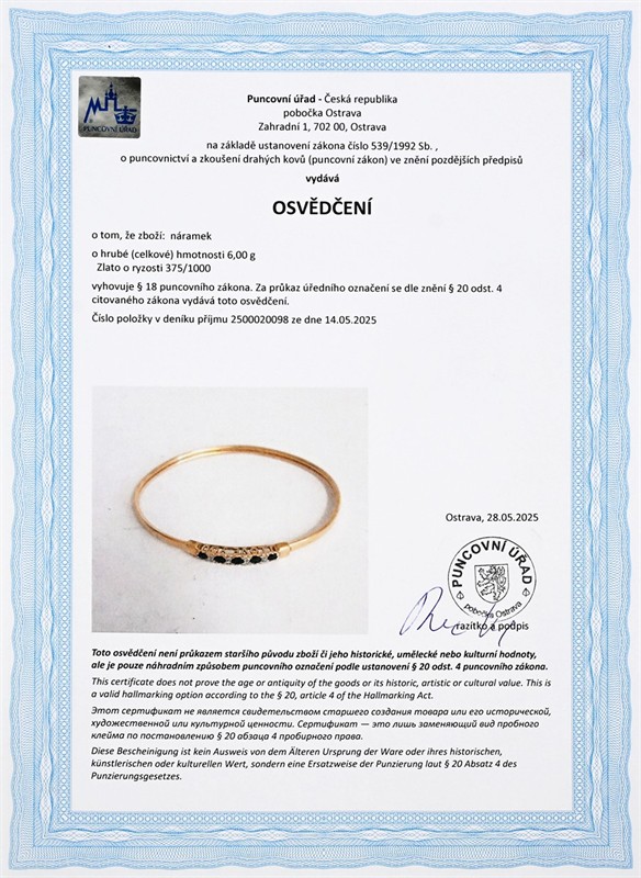 Zlato o ryzosti 375/1000 | váha 6,00 g | přírodní safíry 5 ks, průměr 3,0-3,7 mm | přírodní diamant 8 ks 0,04 ct | dekorativní zpráva I LOVE YOU, na druhé straně ALWAYS | vnitřní míra 6,5 x 5,2 cm, šířka části s kameny 3 cm, hloubka 0,4 cm | výborný stav | osvědčení puncovního úřadu | kameny s garancí pravosti zkontrolované v gemologické laboratoři