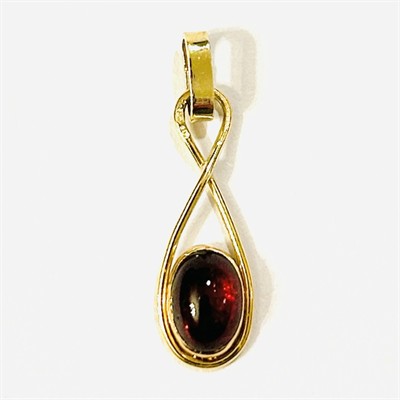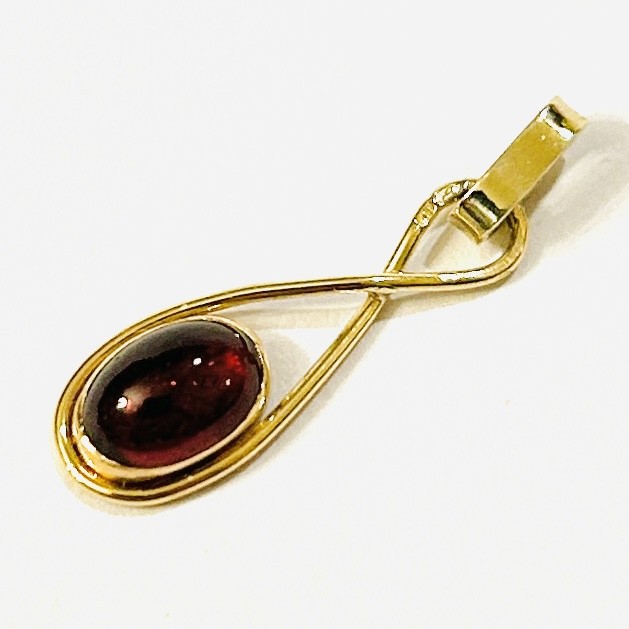 Decentní, elegantní přívěšek ve tvaru smyčky do číslice "8", osazeno oválnou muglí přírodního almandinu fasovaného v plně přiléhající obrubě. Díky červenějšímu odstínu kovu i nadčasovém designu dobře kombinovatelné se starožitnými šperky. Současná tuzemská autorská zlatnická práce. Zhotoveno z narůžovělého žlutého 14 karátového zlata, tj. o ryzosti 585/1000; punc Z-58 (labuť 4) a mistrovská značka "ZT" na oušku. Hmotnost 1,06 g, celková délka 26,5 mm, šířka 7 mm. Stav nový, tedy intaktní.