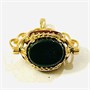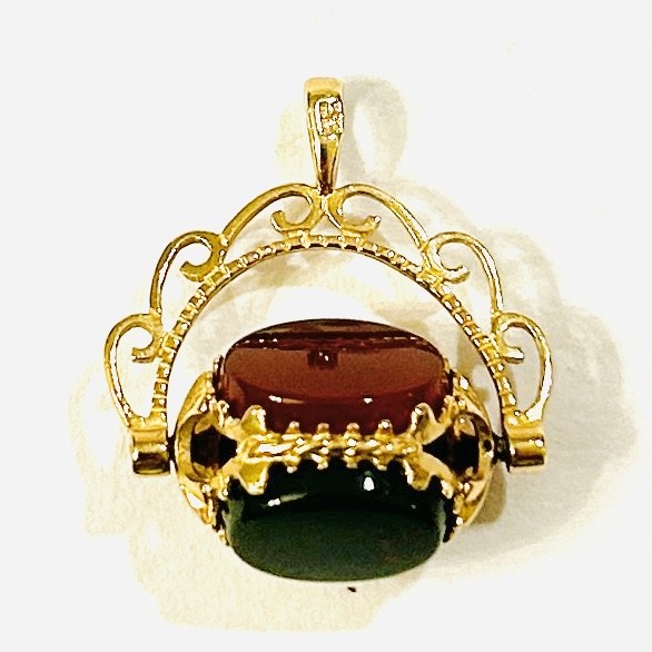Dekorativní, nevšední přívěšek s centrální otočnou ozdobou, která je v prořezávaných krapnách osazena přírodním karneolem, heliotropem a černým onyxem oválného plochého brusu, rámeček s prořezávanými volutami. Podoba šperku vychází z tradice otočných pečetních ověsků u řetízků kapesních hodinek. Kvalitní britská zlatnická práce, patrně z poslední pětiny 20. století. Zhotoveno ze žlutého zlata 9 karátového zlata, tj. o ryzosti 375/1000; konvenční punc Z-62 (váha s 375), britská značka "kotva" (značící Birminghamský puncovní úřad), ryzostní číslo a mistrovská značka "OPT" na oušku. Hmotnost 2,39 g, celková délka 21,5 mm, šířka 19,5 mm. Otáčení v pořádku, celkově ve velmi zachovalém stavu.